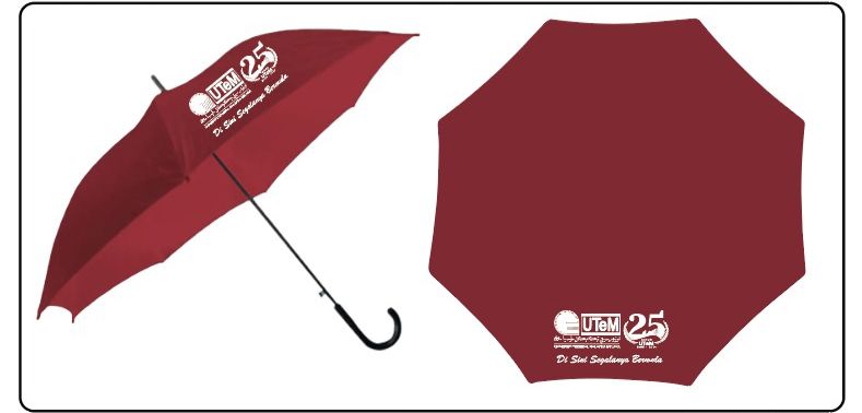 Direka khas sempena sambutan 25 Tahun UTeM, payung ini diperbuat daripada polyester dan praktikal untuk digunakan semasa hujan atau panas. Sesuai untuk kegunaan harian atau sebagai cenderahati istimewa.